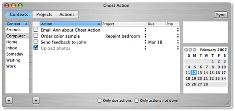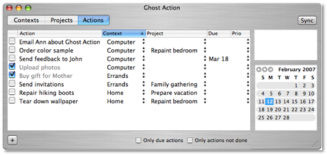 Ghost Action features full two-way synchronization with iCal, which enables synchronization of your to-dos to any iSync compatible device such as a phone or PDA, so that you may access your to-dos even when you are on the move. Users, who don’t use a portable device, can achieve the same goal byprinting their to-do lists.