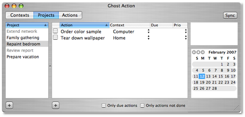 Instead of having a single list full of unrelated to-dos, Ghost Action gives you different views of your to-dos, grouped according to context or project. You will use the project view when planning the next action for your projects. A project can be, for example Repaint bedroom or Review report. You will use the context view to get an overview of what can be done at the current context. A context refers to locations or situations, such as Home, Computer, Work and Errands, that are suitable for doing a certain kind of to-dos.