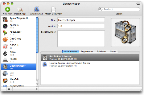 Developer:Jon Trainer Outer Level Corp. 33 Sleeper Street #503 Boston, MA 02210 http://outerlevel.com/licensekeeper/ Released: March 6, 2007. $20 USD Trial Download: http://outerlevel.com/downloads/LicenseKeeper.dmg Requirements: Mac OS X 10.4 or later. Blog: http://outerlevel.com/blog/ FAQs:http://outerlevel.com/licensekeeper/faq/ Strengths: A one-stop-shop for licenses and supporting documentation. Weaknesses: Does not import Emails from non Mail.app Email programs. No password protection for itself. Other Reviews: http://www.macupdate.com/reviews.php?id=24269 |