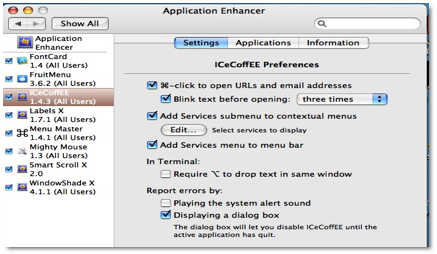 Configuration — To change ICeCoffEE’s settings, open System Preferences (in the ? menu). Click “Application Enhancer”, click the Modules tab, and then select ICeCoffEE from the module list. [See the APE illustration above.]