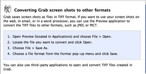 Finally, if your tire of having you screen shot format defined for you, there’s a freeware tool that allows you to predetermine the formal of all images capture with Apple provided tools. Use ESi’s ScreenShots Plus http://www.ego-systems.com/Products/screenshotsprefpane.html. It’s an application that installs as a system preference. It also you to preselect the format and location of screen shots you take. I’ve selected JPEG and desktop as mine since I can use the obtained screen shots with minimal mousing around to find them. Our Screenshots Preference Pane was written to make these Terminal sessions unnecessary. It allows you to change both the file format of your screenshots as well as where they end up on disk, with just a few clicks of the mouse. And, unlike other utilities, there's no need to log out or restart!