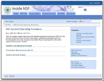 Also, notice the terms “WikiSystems” and “WikiSoftware.” In wikis, the default way of linking is to write new pages in what is known as “camel case:” Two words “munged” together, each having an initial cap. Wiki software is designed to recognize camel-cased terms and to automatically hyperlink them. Again, this is useful in its original conception, but it’s not particularly intuitive for a nontechnical user base such as you would find in most business or government organizations.