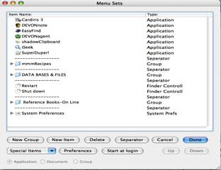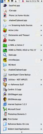Having worked with a wide variety of products that serve as launch applications since June of 2005, I was amazed on how my perspective of launchers has changed. In addition, I have gotten involved in a greater variety of projects, almost all of which need to be organized by ìsub-foldersî making my hard disk multi-layered with respect to folder structure and more complex. There any menu bar launcher I use must be easily reconfigured, at times to lead me, for example, only to a lower level nested folder in which Iím actively working. From week to week, I reconfigure my present ëlauncherí to reflect my work priorities — it must be simple and fast.