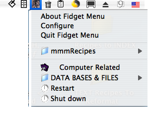 Just for the record, Iím presently actively using both Unsanity's FruitMenu 3.4.3 http://www.unsanity.com/haxies/fruitmenu/ and X-Menu, created by Christian Gruenberg and distributed by Devon Technologies. http://www.devon-technologies.com/products/freeware/index.html. This review serves to introduce you to another tool that you might find useful in getting you stuff together, at least for a while. Having reviewed Fidget Menu 1.3.4 for macC in the June 2005 Issue; I thought Iíd re-review the current version and search out its abilities and weaknesses and the softwareís compatibility with the Tiger OS.