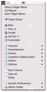 ìFidget Menu is an all purpose launcher. Start Applications, open URLs, or open documents from this Status Menu item. Fidget Menu runs on the right side of your menu bar, giving you quick access to anything you need. Fidget Menu comes with a number of preconfigured items like System preferences and a Sleep command. Uniquely, Fidget Menu offers POP email monitoring with several options for what to do when new mail arrives.