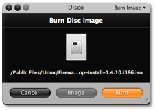 The top middle of the screen is where you enter the volume label. By default it reads “Untitled” and will remain that way unless you change it. There is an option in Preferences to have Disco prompt you if you neglect to fill this in. Though off by default, I’d recommend turning this preference on because it is easy to forget to name a disc in the heat of burning. When you have all of your files gathered and a blank disc inserted, simply click Burn and the process will start. If your goal is to create a file for Internet distribution, then you can click the Image button instead of Burn to create a DMG, CDR or ISO disc image.