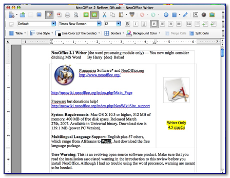 I should point out that Dennis Olsten, who had previously tested earlier versions of NeoOffice which he found too slow wrote in an MacUpdate Review: “With this release of NeoOffice I will forget Microsoft Office. This product is just great, it looks good (as good as an office app can look (;-), it performs great and the ability to exchange documents in Open document format (ODF), PDF or .doc makes it fully compatible.”