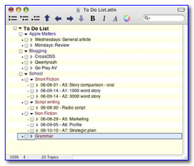 No, I’m not going to write a tutorial on the benefits of using outlines or an assessment of the outline paradigm oriented programs available to both Classic and Macintosh OS X users. Its been done. What this section contains is an annotated list of reference for you to check out outlining for your self.