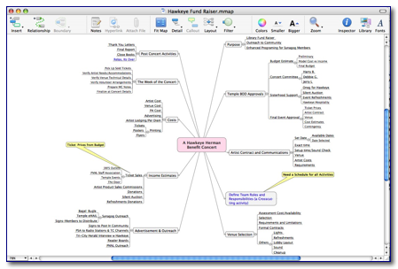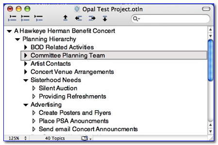 My first and most detailed test of the software was to determine how Opal deals with the task of planning the myriad details for a benefit concert. I’d used that project previously for evaluating a graphics oriented mind-mapping program called MindManager (4.0 macCs) reviewed in the January 2007 macCompanion, Volume 5 Issue 1.