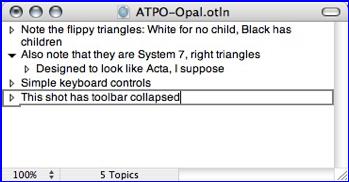 Opal, just like its ACTA progenitor, is has a small footprint, fast, easy to use, and reliable. Although I use, and will continue to use ToDo X for that purpose [Omicron Software - http://www.nomicro.com/Products/ToDo/] that’s a case of inertia, and not any deficiency in Opal. But for my mainstream writing and brains-storming tasks, I’m re-acta-vating my outlining skills with Opal.