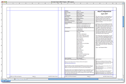 To test QuarkXPress, I worked with the software for more than a month. During that time I created new projects with single and multiple layouts. I have to admit I really liked how easy Quark makes it to add drop shadows to various elements (especially tables – see the layout picture below for the shadowbox effect on the macCompanion masthead). Little touches like this offer a simple and effective method to add visual enhancement to content. And the layout is similar to InDesign or PageMaker or other desktop publishing packages – intuitive if you’ve used any other package in the past and a tad daunting if this is the first DTP product you’ve used.