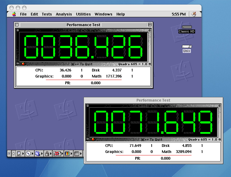 However, running the same test on a Power Mac G5 Dual 2.0GHz with 2.5 GB of RAM yielded less impressive results. Despite the G5 system nearly double the speed of the aforementioned Dual G4, Classic's performance CPU scores remained about the same, whilst SheepShaver fell to half speed once again. In this screenshot example, Classic scored 71.649 / 3289.094 and SheepShaver dropped to 36.426 / 1717.396:
