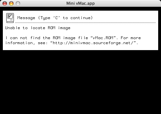 What you must do next is obtain the Mac Plus ROM file, rename it vMac.ROM, and place into the same folder as the Mini vMac application. (Please read the Installation: Basilisk section for hints on how to obtain Mac Plus ROMs.) Once you have done this, you can relaunch Mini vMac and you will see the following: