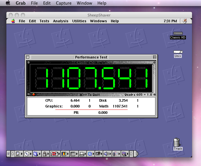 Basilisk fared worse, with a mere 3.026 / 58.766 score. Why these numbers are out of proportion is hard to explain. The only thing I can guess is that the G4 instructions most used by the 68K emulator must be ones which SheepShaver and run more slowly.