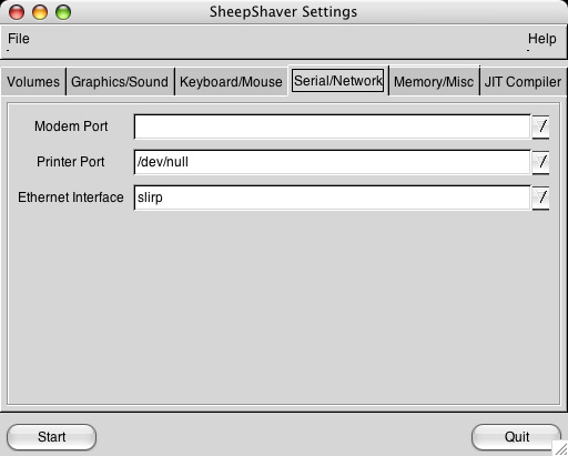 Finally, click on the Serial/Network tab, and set your Ethernet Interface to "slirp" (this will pass along your Mac's internet access to SheepShaver). This diialog should look like this: