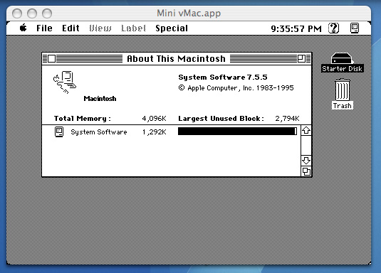 As noted in the SheepShaver installation section, System 7.5.3 was the last freely available operating system for the Mac, and the aforementioned link can be used to access this. The Emaculation web site, a site devoted to Macintosh emulation issues, has a pre-configured System 7.5.5 starter disk that can be used with Basilisk, downloadable here:
