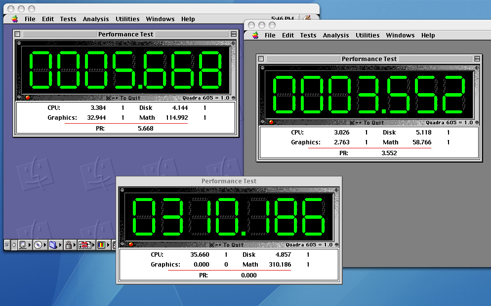 Speedometer 4.0 normalizes all of its tests to the speed of a Quadra 605. Thus, if a test result value is 2.50, this means that this test ran two and a half times faster than would be expected from a Quadra 605. Although Speedometer offers a myriad of test options, I limited to the basic "Performance Test" suite of 4 scores: CPU, Disk, Graphics, and Math. Of these, the CPU score is the most important and indeed the most informative of the tests, following closely behind by the Math score. The Disk score was much less informative, as it tended to be the same across all emulators and Classic. The Graphics test could not even be run at all on Tiger's Classic environment, as it requires the monochrome capabilities long since dropped from modern Macs (although the SheepShaver and Basilisk were able to emulate this). For this reason, I will concentrate exclusively on CPU and Math scores, denoting them as a pair, so that "123.45 / 67.89" means that the CPU score was 123.45 and the Math score was 67.89. It is also worth noting that the same test performed many times will yield different scores, typically with 5% of each other.