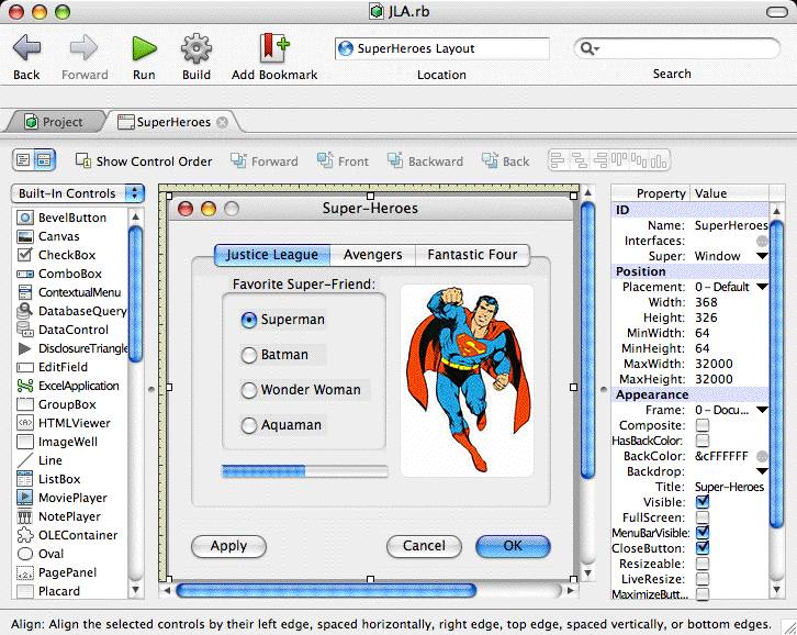 REALbasic is an extremely intuitive and easy application to use. Windows users who have used Microsoft Visual Basic or Visual C# will find it trivial to learn; Macintosh developers will find it easier to use than Apple's Interface Builder. After starting it up, REALbasic will present you with a default project, containing a window and a palette of controls. You can simply drag and drop controls onto your window, name the controls, set properties, override behavior and add code to a control's event method. In addition to the standard controls you will expect to find (eg buttons, checkboxes, edit fields, sliders, etc.), REALbasic provides image wells and canvases for displaying and drawing images, a movie control for displaying QuickTime movies, controls for 3D rendering, TCP network sockets, sprite controls, advanced database controllers, and much, much more. There are a number of books available on REALbasic (see book listing below), any of which would be sufficient to get you up to speed on using it.