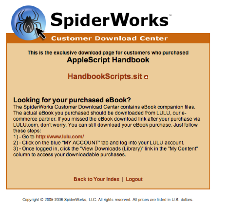 AppleScript Handbook: Mac OS X 3rd Edition by Danny Goodman is another eBook that can be obtained as hardcopy from either Lulu.com or SpiderWorks. However, the electronic copies come with the AppleScript examples that require a Customer Username and Password to get to.