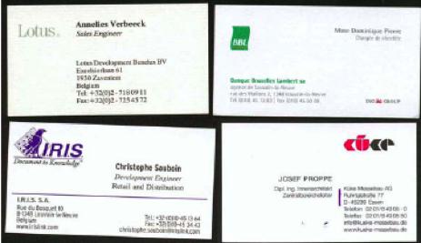 Oh yes, you can scan one card at a time, or put up to 10 cards onto your 8.5 x 11” scanner. In order to make this work, you must cover the cards with a sheet of black paper; the usual white background provided by your scanner’s lid would not work. The white background does not allow the CardIRIS software to distinguish between individual cards. Black borders around a card are ‘coding’ allows you to set and scan multiple cards at once. The group of scanned cards, when scanning in CardIRIS, will appear as a stack of individual cards in the middle of the open CardIRIS main window, one for each card on the ‘glass.’ Each individual image so captured and acquired (OCR’s) can be edited if needed to correct scanning errors. The result is just as if you had put 10 consecutive cards though the IRIS Business Card Reader hardware. To save space, here’s how a four-card scan on my HP scanner looked:
