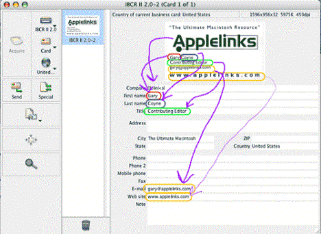 Once the scan(s) is done, you can rotate any card’s image left or right or 180° if necessary. Setting the software’s preferences to automatic does that for you, err, automatically. Then, you can then focus on any particular part of the card to be read or read the whole card. The software also allows you to zoom into the card for a better view, but that does not affect the OCR process. Okay, you’ve captured an image of the business card. What’s next? All of the preceding was about your ‘data’ input — how about outputs? I found this illustration was a great review of the IRIS hardware and software by Gary Coyne [Applelinks, 08-27-04, http://www.applelinks.com/p5/index.php/more/cardiris