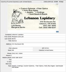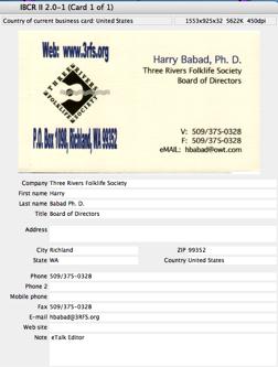 I.R.I.S. Inc. (561)-921-0847 http://www.irislink.com/c2-190/Cardiris.aspx Support: http://www.irislink.com/c2-261/I-R-I-S--Technical-support.aspx $50 USD File Size: ca. 74.5 MB Excellent Manual and Uninstaller: provided Requirements: Mac OS X computer with a G3 processor or a Mac OS 9.x computer with a PowerPC processor and Mac OS X and Mac OS 9.x. In addition, 32 MB RAM, 80 MB free disk space, CD-ROM Drive. Comparable PC Version Available Audience: All collectors of business cards, newbies or expert level users. Strength — The software is idiot and newbie proof, and so easy to use. From your paper business cards to your updated address book or as text or database files, done in 3 easy steps. It’s very simple and accurate. Your cards are converted to electronic contacts in minimal time. Weakness — I’ve found no significant problems when using this product for 47 of 50 cards, a contrarians test set, that I scanned. Although optical character reader [OCR] products are supposed to be only 99+% accurate, this product seemed to have a higher accuracy. As noted below, highly colored backgrounds on cards don’t OCR well in either CardIRIS or Read IRIS 11. The software was tested on a 1 GHz dual processor PowerPC G4 Macintosh with 2 GB DDR SDRAM running under OS X 10.4.5. I used an IRIS Business Card Reader II or an HP ScanJet 8250 scanner for testing. Product and company names and logos in this