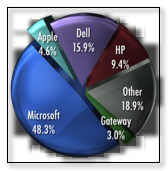 A common error in comparing market share numbers is forgetting that Apple sells both the hardware and software. Comparing Apple's PC market share with the two market leaders, Dell and the merged HP/Compaq, ignores the fact that while Dell and HP each sold ten times as many PCs as Apple, they had to pay Microsoft for an operating system on every sale.