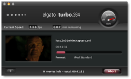 Turbo.264 is a powerful video encoder in the form of a compact USB 2.0 stick. Use the included software to convert your Mac videos one at a time or in a batch; The application drops the converted file(s) into iTunes for you, ready to synch automatically with your iPod, Apple TV or Sony PSP.