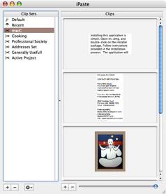 Editing Text Clippings — I also am delighted with the fact that, in the main iPaste window, you are allowed to easily edit the contents of a stored text clip, allowing you to correct errors in the original clipping. Such changed clippings remain be accessible and depending on how you’ve set the preferences for that clipping set, from almost any application. When editing or for legibility reasons, you can expand the clipping’s visibility using the slider bar at the bottom of clipping set list, a nice screen space conserving feature.