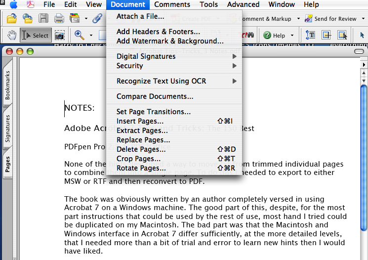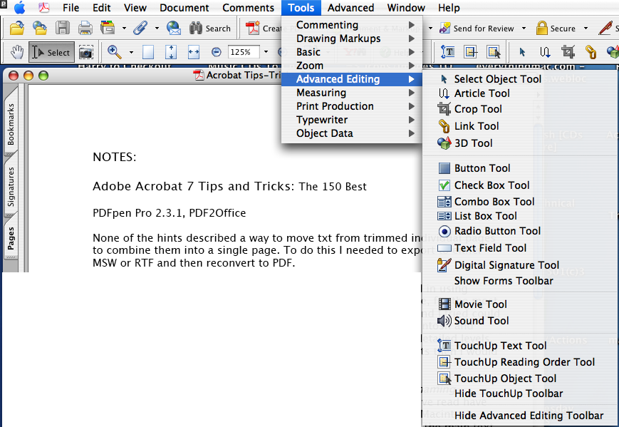 From my perspective, as somewhat experienced user of Acrobat 7, Chapters 9, Transforming a PDF Document and Chapter 10 Touching Up and Modifying a Document were the most useful chapters of Tips and Tricks. Although, by trial and error, I had learned to use about half of these features, it was great to read about their uses in a systematic way. Chapter 10 focuses on advanced editing features that are less intuitive then those described in Chapter 9.