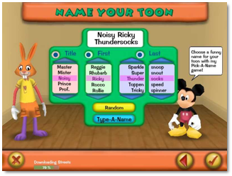 The game starts with you creating your Toon. You can change the head, body, legs, and apparel of your Toon. The Apparel consists of a shirt and a skirt for girls or pants for boys. You can change the colors of all these things as well, creating a wide variety of very interesting creatures! Although you can type a name for your Toon, the program has a fun name creator feature. You can select from a title, first name and last name. The choices are very diverse and all a lot of fun. After viewing a variety of choices, I settled on Noisy Ricky Thundersocks for my Toon’s name. One could spend a lot of time just naming their Toon.