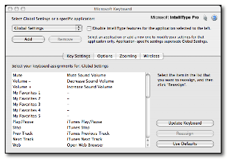 So yes, this is a repackaged, repurposed Microsoft Wireless Laser Desktop 6000 PC keyboard and mouse http://www.techgage.com/review.php?id=4425 with software that works with Mac OS X. The proprietary functions can be turned off and the Mac OS X keyboard functions can take over, but that means the extra functionality for zoom and my favorites won’t be there. The zoom in and out and smooth wheel functions will not work as nice. So does 30 MB of hard drive space justify use of the my favorites keys and the zoom features? I do not know. I thought the multimedia keys were a nice thought, but I really like the mute key and the calculator button. I’m not too hip on the log off and sleep buttons, but that’s just me. And the soft palm rest is a nice touch (pun intended).