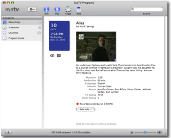 The EyeTV software is currently at version 2.2.1, is a Universal Binary, and has an incredibly clean and functional interface that takes its cue from Apple's software but exceeds even that in its ease-of-use. Recorded shows are displayed in a manner that combines the sortability of the Finder's list view, the active image preview of icon view, and the detailed file information of column view. And the size of the listings can be resized on the fly with a slider.