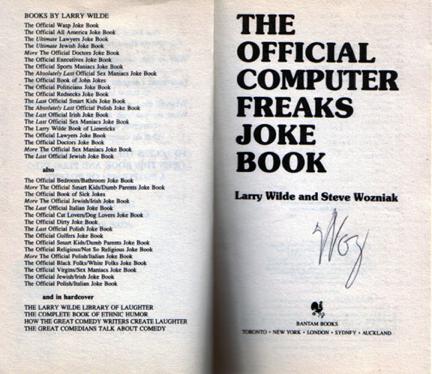 When the event ended, a handful of Mac geeks ran across the room to meet the Woz. He politely stood up, and took time to chat with each person one-on-one. He signed people’s computers, books, posters, and even posed for pictures. Woz signed my copy of his rare 1988 joke book, and I gave him an Applemacpunk business card. He put the card in his wallet and told me he’d be sure to check out the site later that night. The schoolteacher that sat next to me during dinner had him sign an old Apple Educational poster that featured Woz and his son. The other two Apple addicts at the table had him sign their vintage computers.