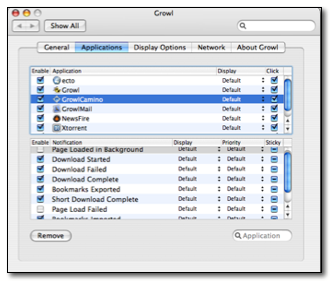 There are a few other customizations that you can make to keep you running on your toes, however. First off, GrowlCamino places it’s own preference pane in your Camino Preferences as well as in System Preferences, so check both areas to make some tweaks, but the basic setup should be just fine for everyone. You can also make a lot of tweaks to each applications behavior by using the “Applications” tab in the Growl area of System Preferences. A few applications, like Newsfire, don’t even use Growl by default and you have to enable it if you want to use it. Just select that application and put a checkbox by the feature that you want the notifications to appear for. Other applications have settings to change, so that you can be notified more or less, just to your liking.