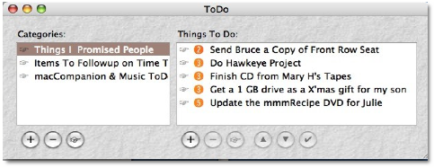 As an aide, for stuff I need to continuously paste into my work I still keep items in shadowClipboard [MacC October 2006.] Readers, no flaming me about ToDo alternatives — I’m aware that there are at least 17 new and updated (2005-6) OS X compliant ToDo list products on the MacUpdate, but that‘s for future reviews. Note that looking for check list on MacUpdate only find two suitable items; aren’t search tool wonderful. |